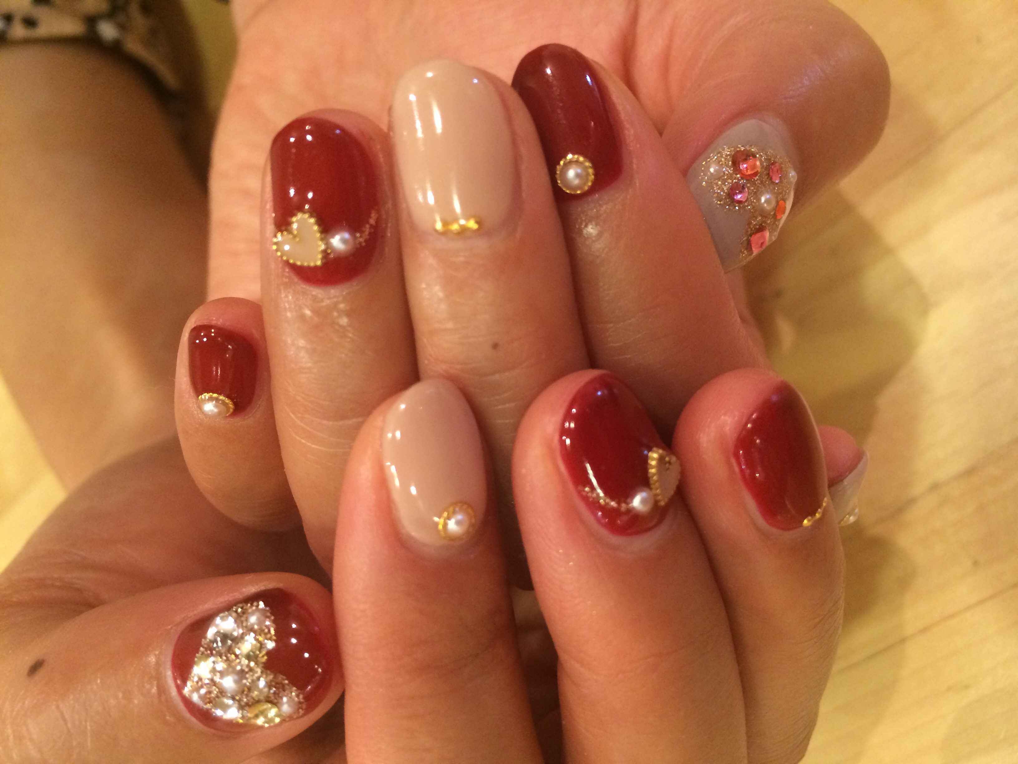 赤がしたくなる季節になってきましたね✨ハートのビジューネイル❤️