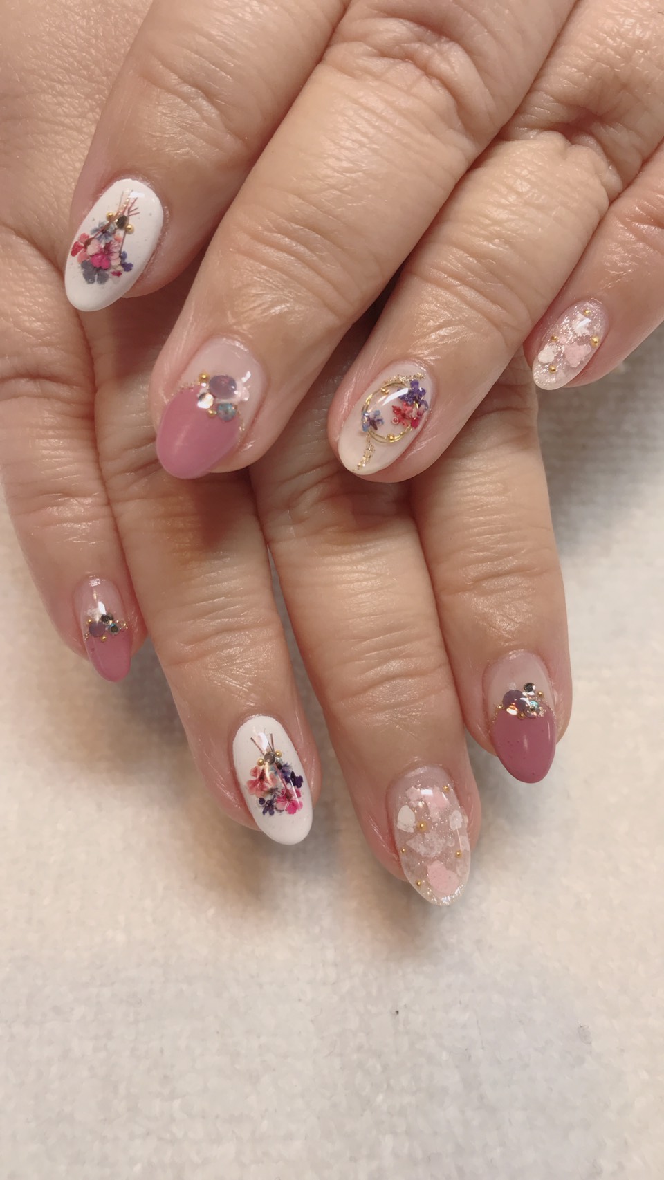 花束ネイル エムエトワのMAYUです!先日のお客様ネイル💅花束ネイルです🌸春らしい素敵なネイルになりました✨ #二子玉川ネイルサロン#二子玉川プライベートサロン#二子玉川大人ネイル#花束ネイル#スプリングネイル